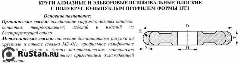 ГОСТ 16180-91 Основное назначение: шлифование стружко-ломных канавок, оснастки, твердосплавных изделий и изделий из быстрорежущей стали. 1FF1X-круг плоский с полукругло-выпуклым профилем 125х6х4х3х32 (DxTxXxRxH)-диаметр и высота круга, толщина алмазного слоя, радиус закругления, посадочный диаметр мм R3,0-радиус закругления рабочей поверхности АС4 160/125-марка и зернистость шлифпорошка из синтетических монокристаллических алмазов 100%-концентрация В2-01-связка органическая 38кар-масса алмаза, карат ГОСТ16180-91