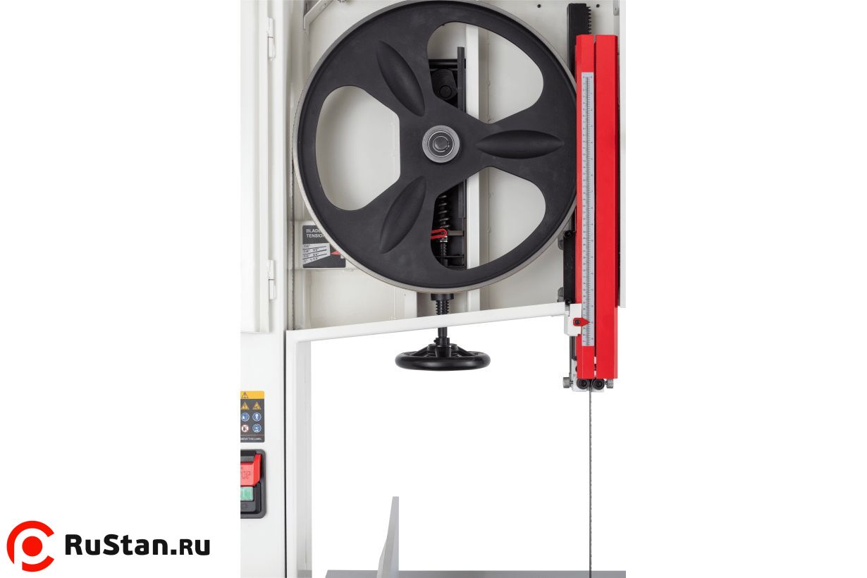 Натяжение пильной ленты осуществляется одним движением рычага. Направление ленты обеспечивают две группы трехроликовых направляющих на шарикоподшипниках (над и под столом). Для контроля используются стрелочный индикатор натяжения и смотровое окно. Плавность хода обеспечивают компьютерно сбалансированные чугунные шкивы.