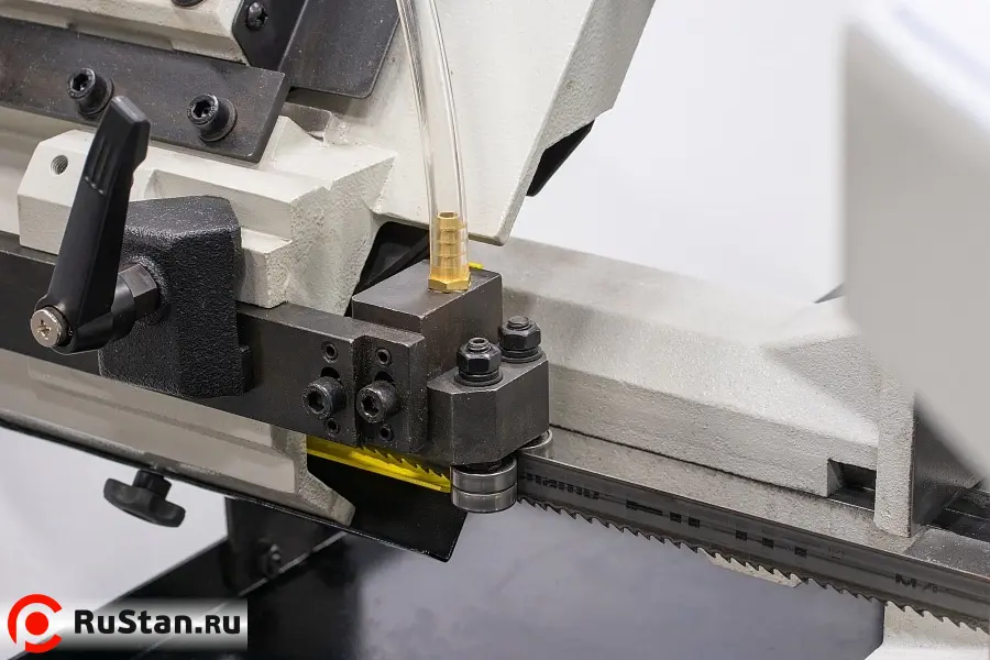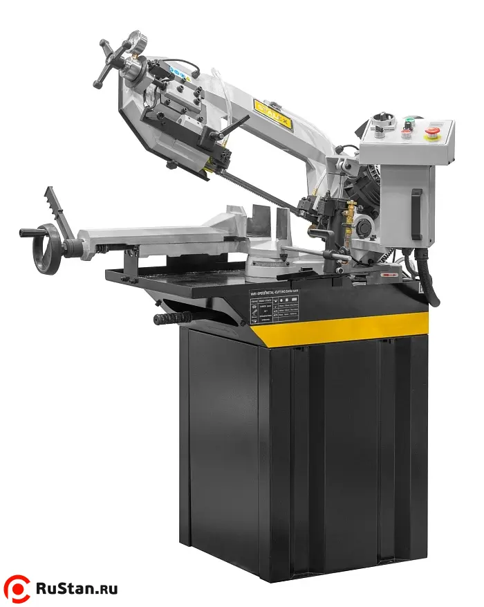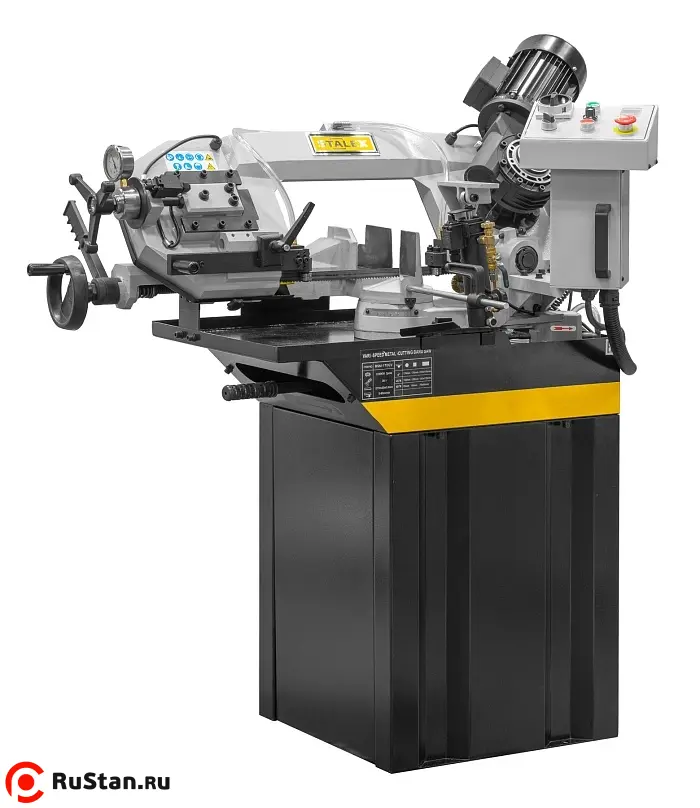 Модель имеет быстрорегулируемые тиски для резки под углом, поворачивается рама, а не заготовка. Тиски с системой быстрого отвода ускоряют процесс смены заготовки (ускоренный отвод подвижной губки происходит без вращения маховика). Зажим заготовки осуществляется тисками вручную, подача заготовки - также вручную. Наличие системы СОЖ в стандартной комплектации – позволяет добиться высокой производительности.