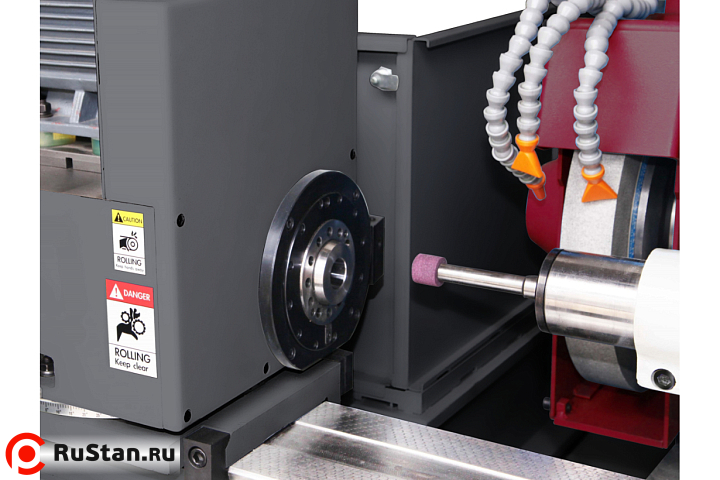 Рабочий стол перемещается по направляющей станины (ось Z), и стол образован верхним столом и нижним столом, верхний стол может поворачиваться для шлифования конической поверхности. Рабочий стол приводится в движение серводвигателем и ШВП, может осуществлять ручную подачу, толчковую подачу, автоматическую подачу и набор перемещений. Шлифовальная головка совершает поперечное перемещение (ось X): перемещается по линейной направляющей и приводится в движение серводвигателем и ШВП. Прецизионная линейная направляющая обеспечивает плавное движение, высокую точность и быструю реакцию. Также она может выполнять ручную подачу, толчковую подачу и автоматическую подачу, а также функцию быстрого реверса. Приводная рабочая головка и хвостовик установлены на рабочем столе для зажима обрабатываемой детали и ее поворота. Станок оснащен защитными кожухами с электрозамками. В стандартной комплектации станок оснащен полупрозрачным экраном.