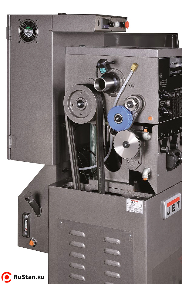Для удобства оператора при переключении режимов предусмотрен толчковый (импульсный) режим работы. Задняя бабка станка снабжена механизмом поперечной регулировки, что позволяет обтачивать конические заготовки. Станок устанавливается на массивную станину из серого чугуна, направляющие которой закалены и отшлифованы в соответствии с фирменной технологией JET.