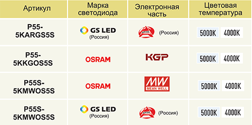 P55-5KPHOS5S – модель с цветовой температурой 5000K (Дневной белый).